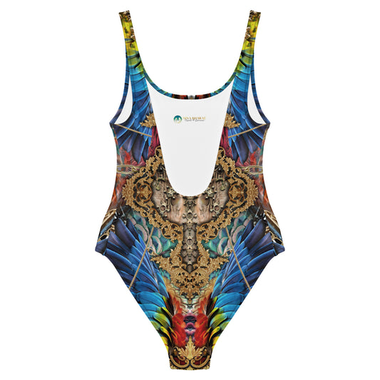 Nina Sharae Swimwear | One-Piece Swimwear Bathing Swimsuit | Blue, Orange Tropical Flowers Ropes and Chains