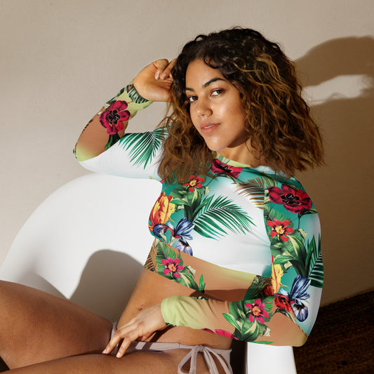 NINA SHARAE SWImWEAR | LONG SLEEVE CROP TOP - TROPICAL ORANGE MINT GREEN HAWAIIAN PRINT | PLUS SIZE