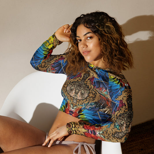 Nina Sharae Swimwear | Recycled Long-Sleeve Crop Top Blue Hawaiian Rope & Flowers