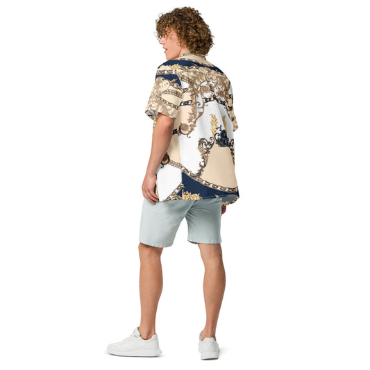 NINA SHARAE MEN'S SWIM TRUNKS QUICK DRY BEACH SHIRTS WITH POCKETS | BLUE, WHITE, GOLD CHAIN PRINT COLLARED SHIRT | UNISEX