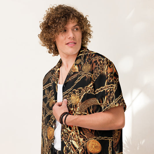 NINA SHARAE MEN'S BATHING SUITS SWIM TRUNKS QUICK DRY BEACH SHIRTS WITH POCKETS | BLACK , GOLD ANIMAL AND CHAIN PRINT COLLARED SHIRT | UNISEX