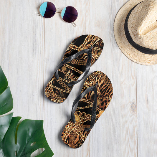 NINA SHARAE SWIMWEAR | BEACH FLIP-FLOPS SHOWER SHOE | BLACK, GOLD CHAIN ANIMAL PRINT